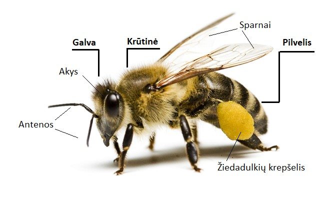 Bitės kūno sandara: galva, krūtinė ir pilvelis